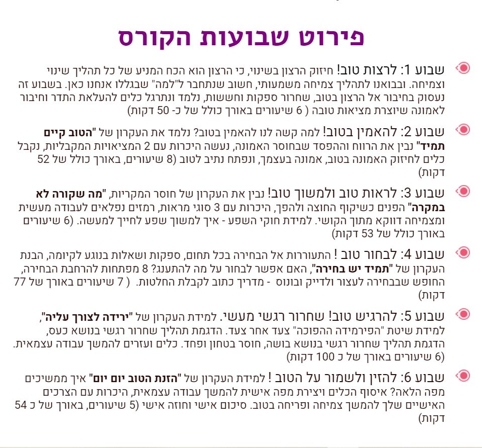 שבוע 6: להזין ולשמור על הטוב ! למידת העקרון של "הזנת הטוב יום יום" איך ממשיכים מפה הלאה? איסוף הכלים ויצירת מפה אישית להמשך עבודה עצמאית, היכרות עם הצרכים האישיים שלך להמשך צמיחה ופריחה בטוב. סיכום אישי וחוזה אישי (5 שיעורים, באורך של כ 54 דקות)