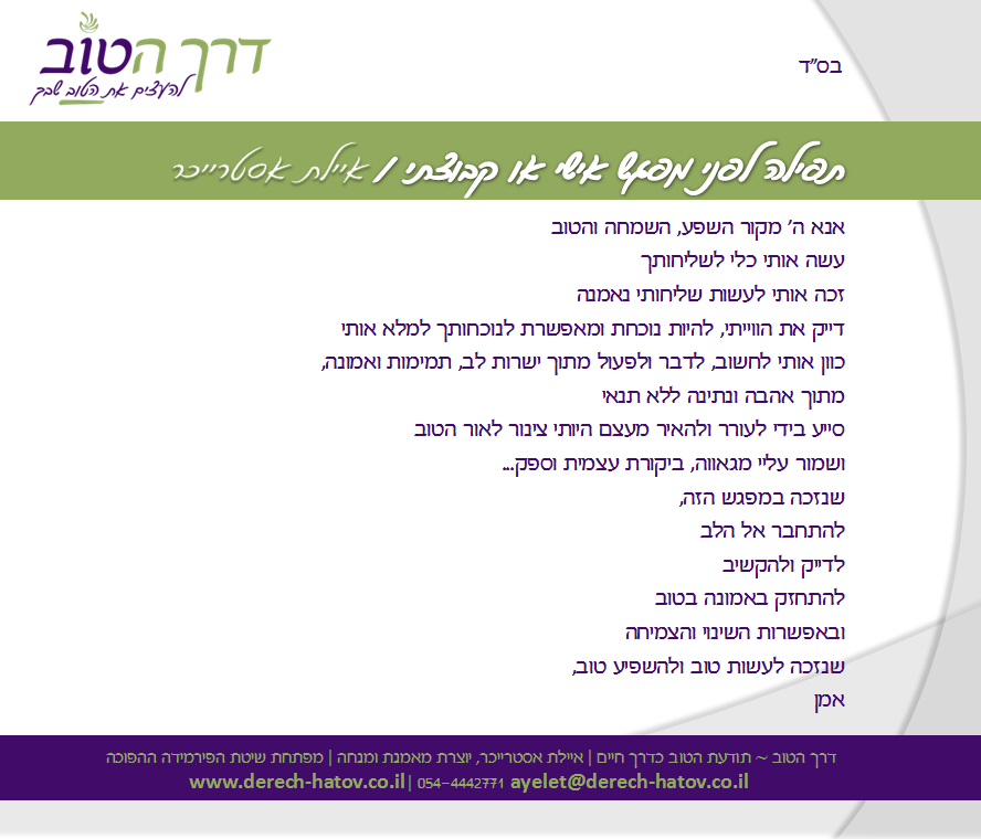 מעבר לכל אלה, בעיקר מה שקורה שם זה הקשבה ודיוק, התבוננות מתוך אהבה וחמלה, שמאפשרת הבנות חדשות ודיבורים שנוגעים ללב ומאפשרים להבנה להתחבר פנימה. וכמובן, אני תמיד מתפללת לפני המפגש, תוך כדי המפגש ואחריו, שאני עצמי אהיה כלי ראוי ואזכה להיות שליחה נאמנה בע"ה. בתמונות תוכלי לראות את התפילה שאני נושאת לפני כל פגישה.
